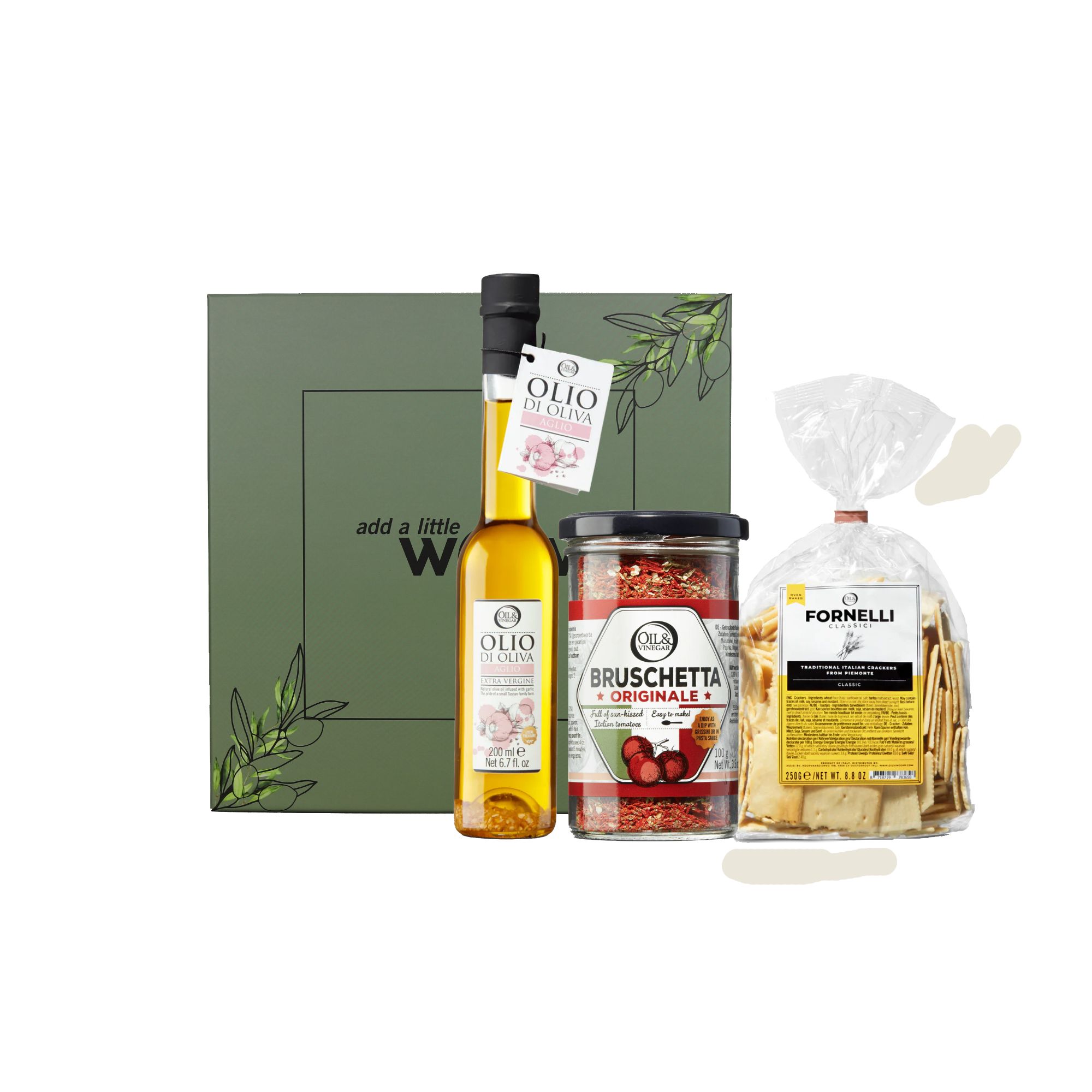 Wer ist kein Bruschetta-Liebhaber? Mit diesem Bruschetta-Paket machen Sie jemandem garantiert ein schönes Geschenk. Mischen Sie die Bruschetta-Mischung mit dem Olivenöl extra vergine mit Knoblauch, verteilen Sie es auf dem Bruschetta-Toast und schon können Sie den perfekten italienischen Snack genießen. Genießen!